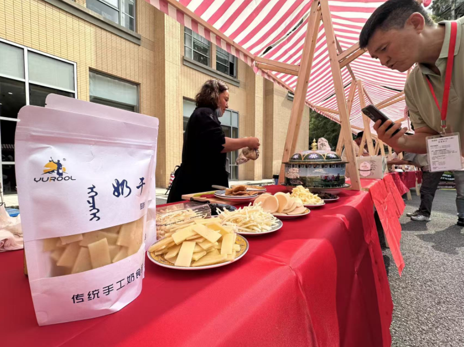 活动现场精心布置,花车上琳琅满目地陈列着由“头雁”学员们不远千里从家乡带来的各类特色农产品。来自呼伦贝尔、锡林郭勒、科尔沁等草原腹地的优质风干牛肉、醇香奶制品(奶酪、奶皮子、奶豆腐等)、高品质牛羊肉制品、牧民特色非遗手工艺品等,吸引了众多流连的目光。